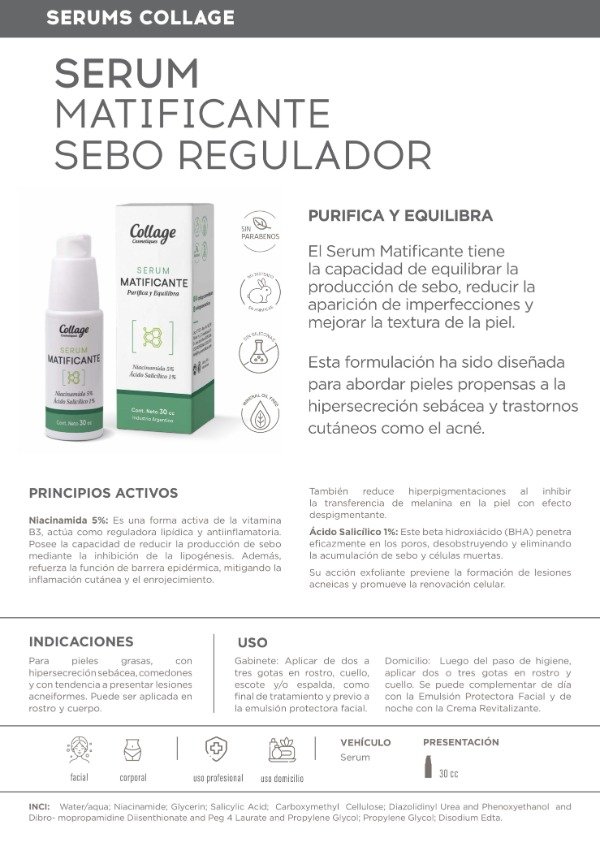 El Serum Matificante tiene la capacidad de equilibrar la producción de sebo, reducir la aparición de imperfecciones y mejorar la textura de la piel. Esta formulación ha sido diseñada para abordar pieles propensas a la hipersecreción sebácea y trastornos cutáneos como el acné.