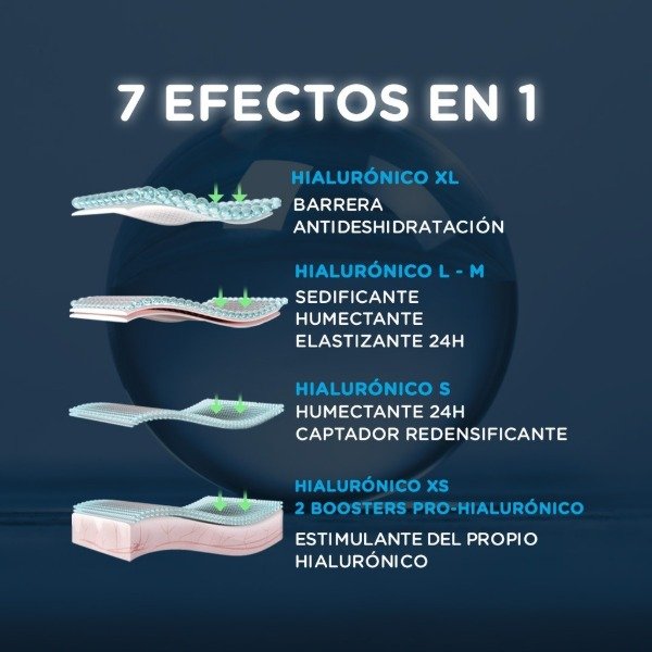 Este serum representa una evolución en los rellenos antiarrugas cosméticos en base al Ácido Hialurónico porque une diferentes tipos de moléculas y boosters ProHialurónico en un extraordinario EFECTO 7X. Actúa en simultáneo en distintos niveles cutáneos por lo que combina acciones de resultados inmediatos junto a estímulos profundos que evidencian resultados a lo largo del tratamiento.